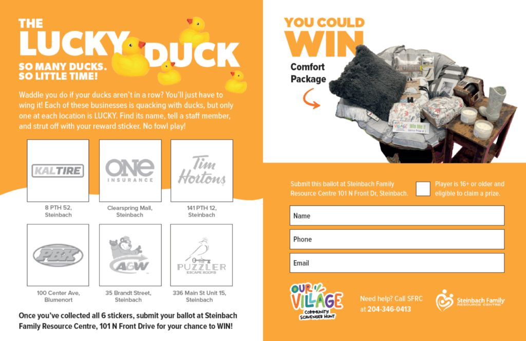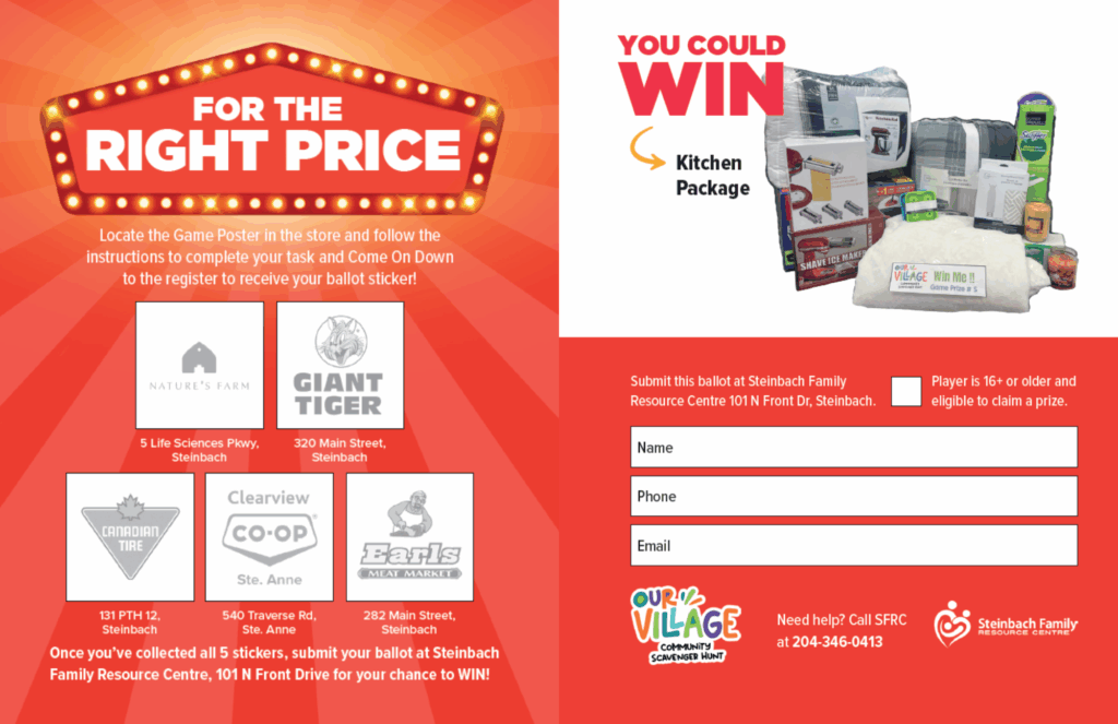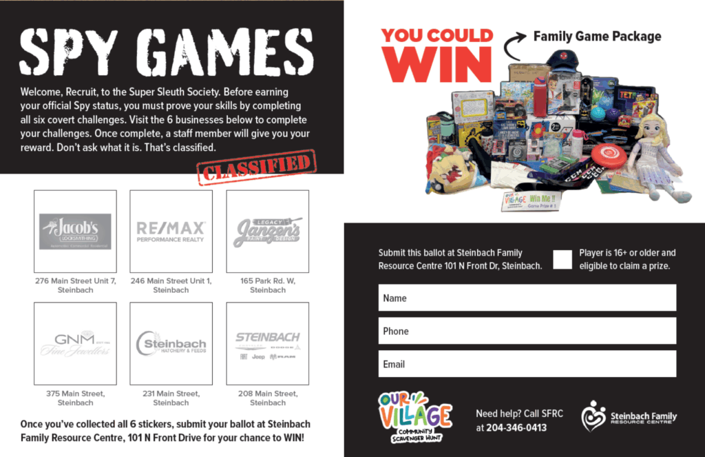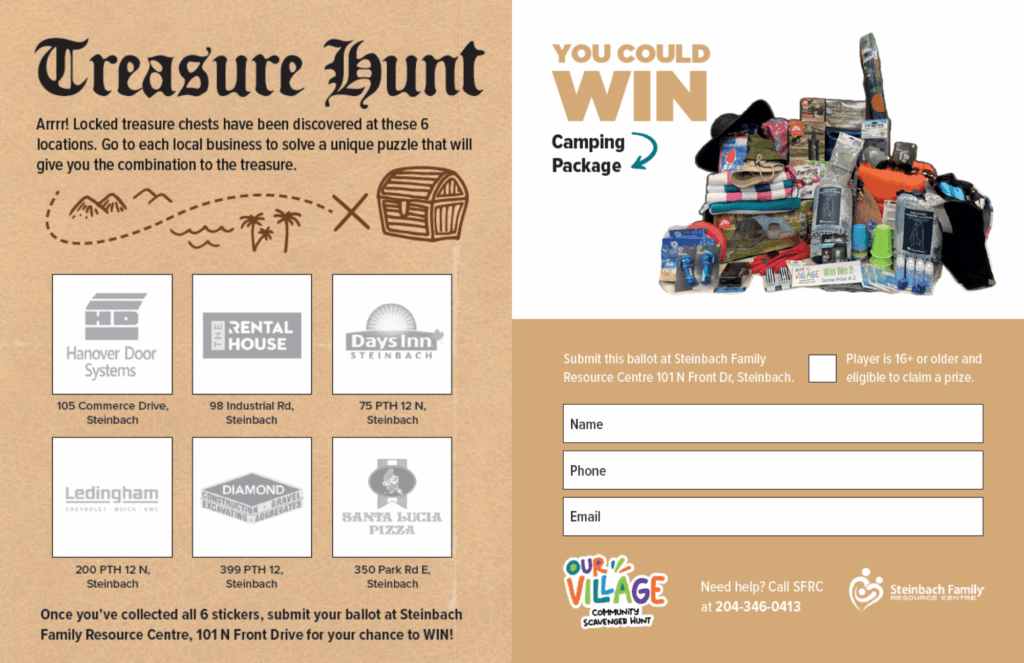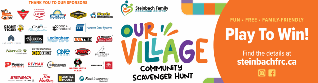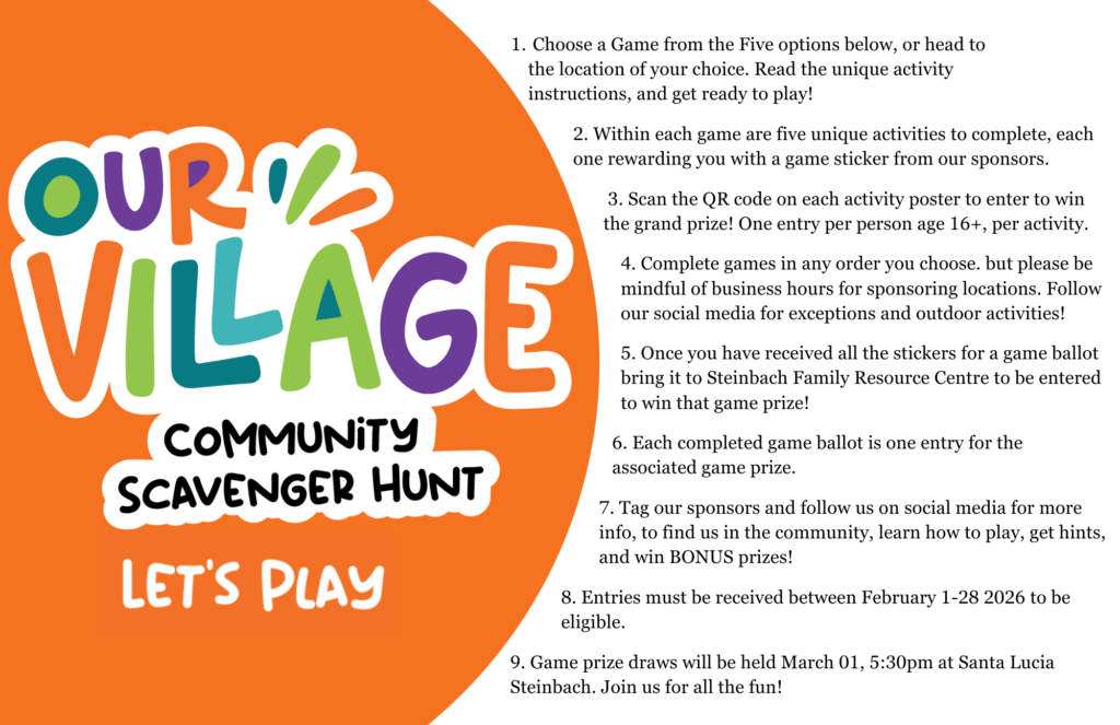 No purchase necessary to enter. Individuals ages 16yrs+ are eligible to win, one entry per activity, and one entry per game, per person. Prizes have no cash exchange value. Participation in all activities in Our Village Community Scavenger Hunt is voluntary, and your participation in all associated activities is at your own risk. Participants may discontinue participation at any time without penalty. By participating, players agree to hold harmless and release Steinbach Family Resource Centre, its staff, volunteers, directors and all sponsoring businesses and their staff, volunteers and stakeholders from any and all claims, including negligence, physical injury, illness or economic loss that may be suffered as a result of their participation, travel to or from any activity, or any events incidental to this activity.