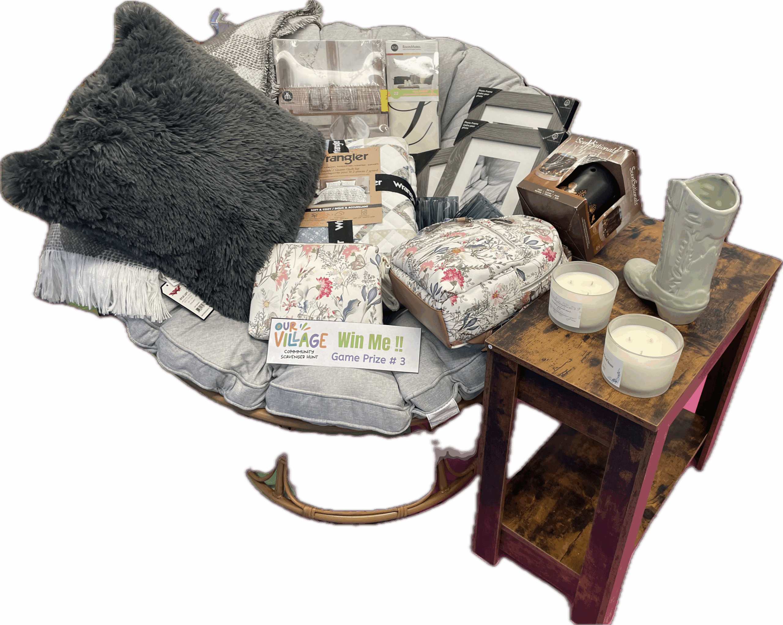 Unwind and relax with this cozy comfort package featuring a beautiful wicker chair, soft pillows, soothing candles, and more. Perfect for creating a peaceful space to sit back, slow down, and enjoy a little self-care—you deserve it